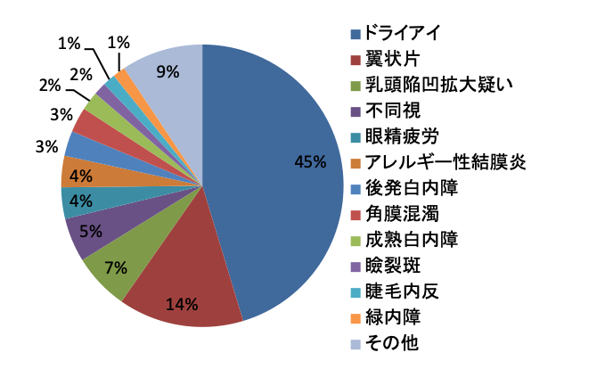 手術で一番多いのはやはり白内障・ついで翼状片(結膜の下にある細胞が異常に繁殖して、目頭のほうから黒目にかけて三角形状に入り込む病気)が続きます。
